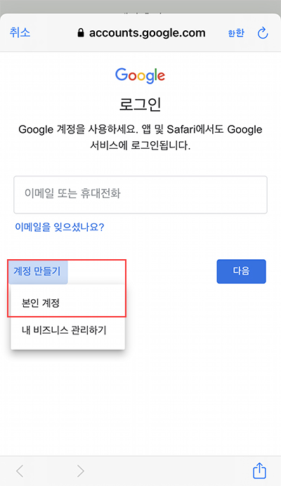 그 후, 로그인 창이 나오는데 그 아래 계정 만들기를 누르면 본인 계정이 나온다. 본인 계정을 누른다.