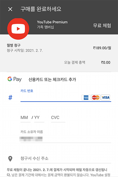 유튜브 어플로 들어가지 말고 사파리나 Chrome 등 웹브라우저로 유튜브에 접속한 후 로그인을 하고, 오른쪽 상단의 내 프로필을 탭한 다음 YouTube Premium 가입을 터치한다. 제대로 우회가 잘 되었다면 루피 (₹) 모양이 뜬다. 나는 가족 요금제를 쓸거라 ₹189.0 로. 만약 그냥 쓸거면 그 위의 메뉴를 터치하면 된다. 무료 체험하기를 누르면 신용카드를 추가하는 곳이 나온다. 일단 인도로 위치를 선택하고 주소를 입력하면 된다.