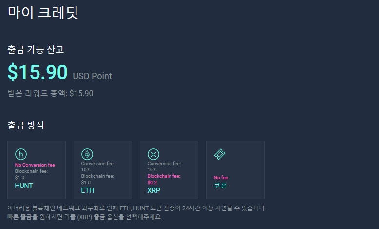 출금은 크게 4가지 방식이 있는데, 헌트, 이더리움, 리플 3가지의 코인으로 출금하는 방식과