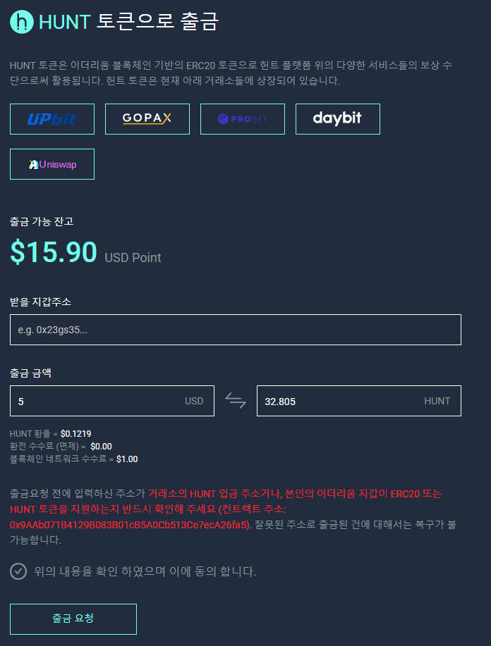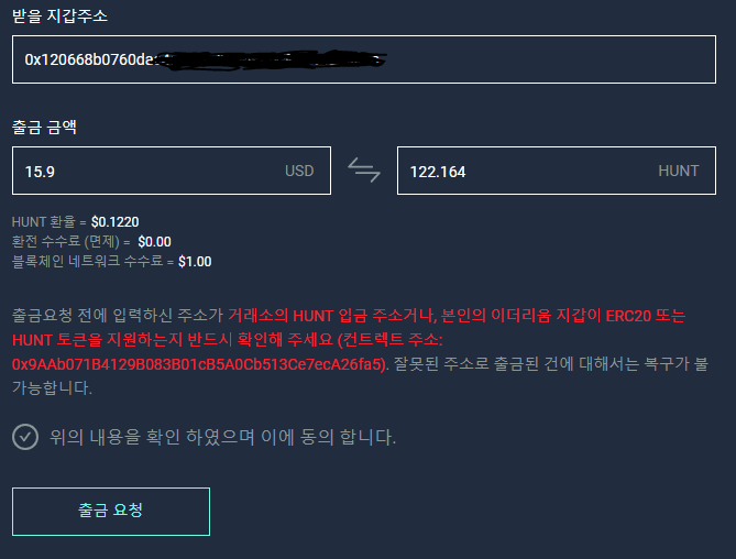 저 위에 받을 지갑주소 란에 내 헌트코인 주소를 입력하고 출금 금액을 입력하면