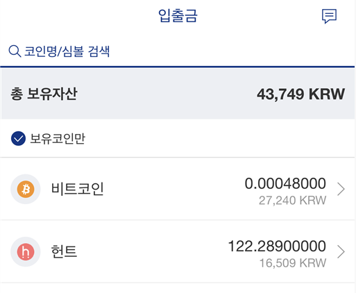 내 보유자산과, 그 아래 코인명 검색란이 나오는데,