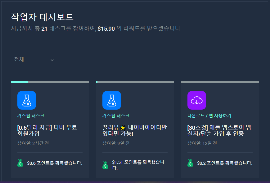 내가 이제까지 몇개의 태스크에 참여했고, 얼마의 리워드를 받았는지 나온다.