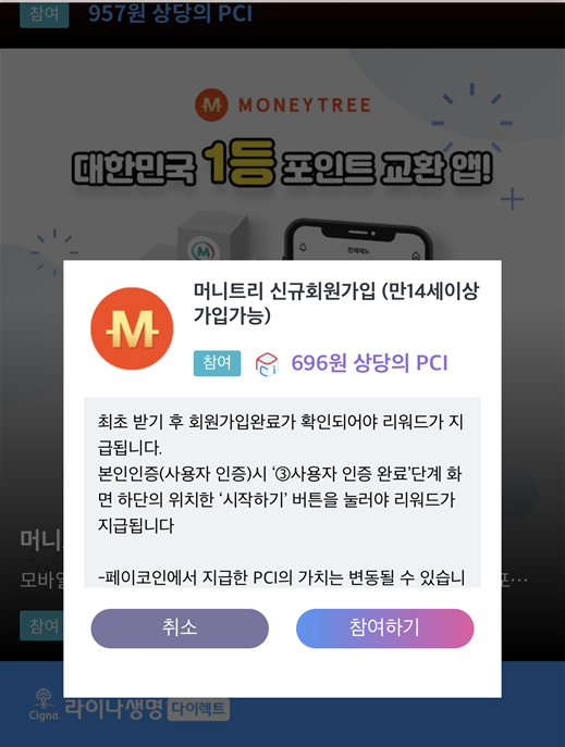 그 중 페이코인의 충전 이벤트 중 머니트리에 가입하면 포인트를 주는 이벤트를 진행하는데,