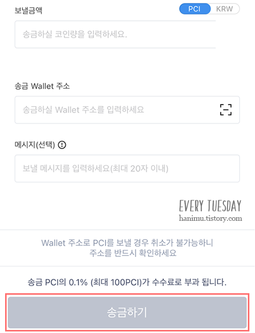 보낼 금액을 입력하고 아까 복사한 주소를 송금 Wallet 주소란에 붙여넣기 한 다음
