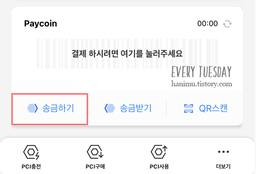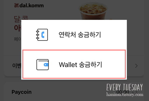 바코드 아래쪽에 있는 송금하기를 눌러서 > Wallet 송금하기