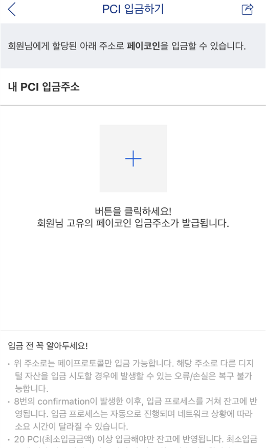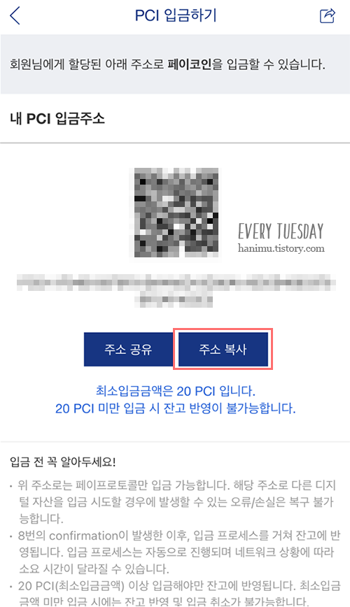 내 PCI 입금 주소의 화살표를 눌러 입금 주소를 발급 받아서 주소를 복사를 누르고 확인!